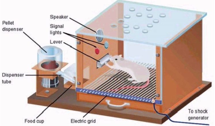 이것은 스키너가 스스로 '스키너 박스'라고 명명한 조그만 실험상자이다. 그림을 보면 상자 앞에는 먹이통이 있고 쥐가 잡고 있는 레버를 누르게 되면 먹이가 나오는 구조이다. 여기서 우연히 쥐가 돌아다니다가 레버를 누르게 되었을 때 먹이 즉 레버를 누르는 행동에 대한 먹이(정적 강화물)가 주어지고, 쥐는 레버를 누르는 행동의 빈도가 증가하였다. 두 번째는 상자의 바닥에 전류가 흐르는 장치가 있고 마찬가지로 레버를 누르면 전류가 흐르는 것을 막을 수 있다. 실제로 전류를 통하게 하자 쥐는 상자에서 이리저리 도망 다니다가 레버를 누르게 되었을 때 전류가 멈추는 것을 경험하게 된다. 그렇다면 여기서 전류가 멈추는 것을 부적 강화물이라고 할 수 있을 것이다. 왜냐하면 레버를 누르는 빈도가 증가하게 만든 건 전류가 흐르는 것을 멈추어 주었기 때문이다. 결국 이 실험으로 알 수 있는 것은 이것이다.