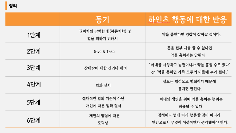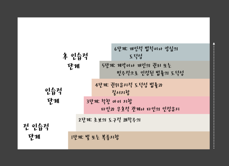 위의 그림은 콜버그가 제시한 도덕 발달단계이다. 먼저 도덕 발달단계란 위의 상황을 제시하고 하인츠의 행동이 옳은지, 왜 그렇게 판단하였는지를 질문하여 아동의 도덕적 판단이 어떻게 추론되는가에 관심을 가지고 구체화한 이론이다. 인간의 도덕성은 단계별로 발달이 이루어지고 단계를 뛰어넘을 수 없다고 이야기한다. 다시 말해 5단계의 도덕 수준을 가지기 위해서는 1단계부터 4단계까지의 도덕 수준을 차례대로 발달시켜야 도달한다는 뜻이다.